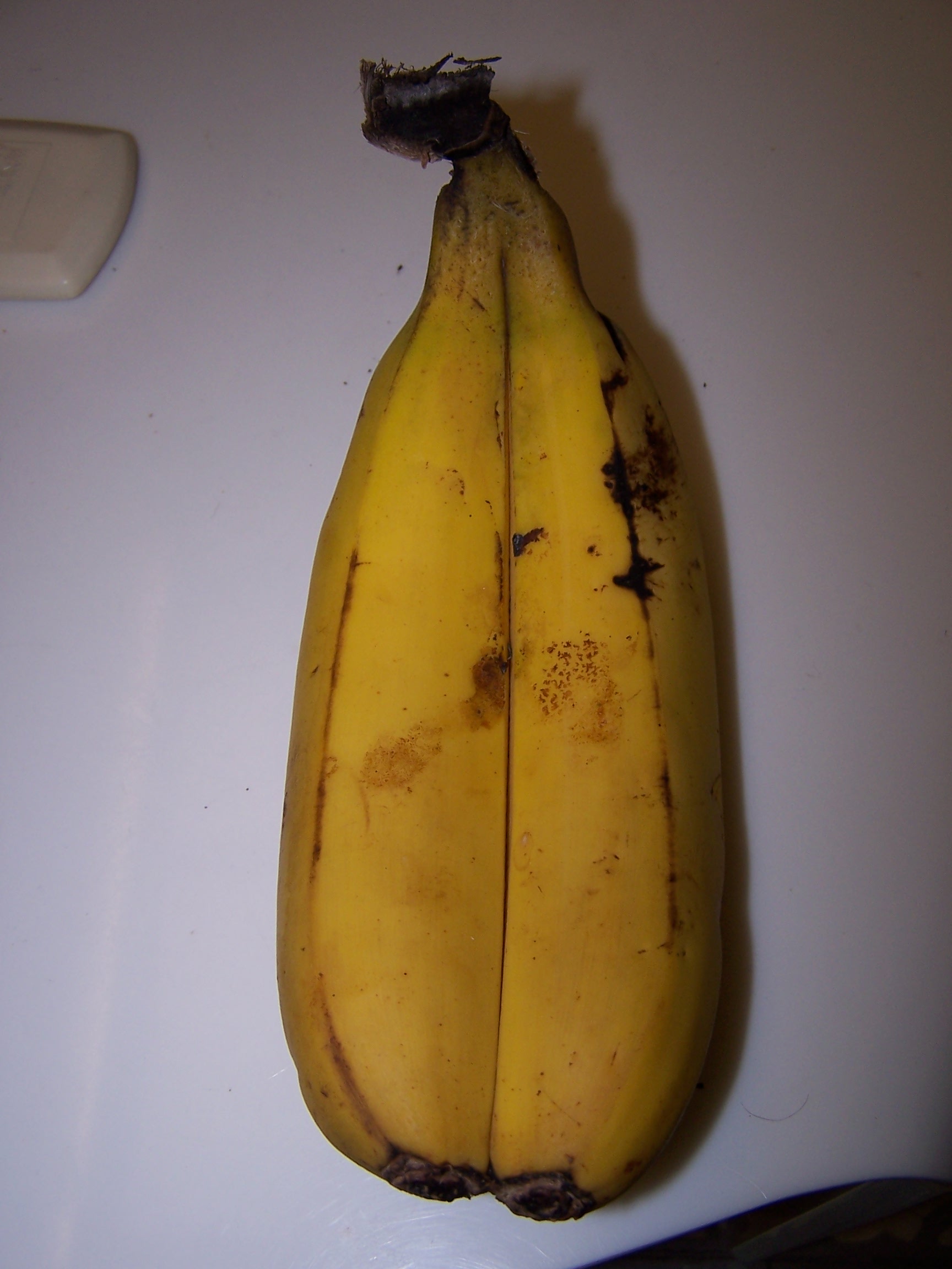 Cuando abrí la cáscara, pude comprobar como los plátanos en sí, no estaban unidos por dentro (la chicha vamos), solo se habían unido las cáscaras (las 2 cáscaras formaban 1 sola), pero su fruto interior era independiente del compañero.