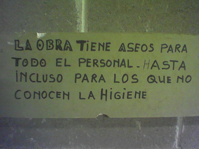 Hoy en las catacumbas de unas obras de un hotel de lujo, he visto el siguiente cartelito, dedicado, con mucha razón a la mayoría del personal que pululan por las obras.